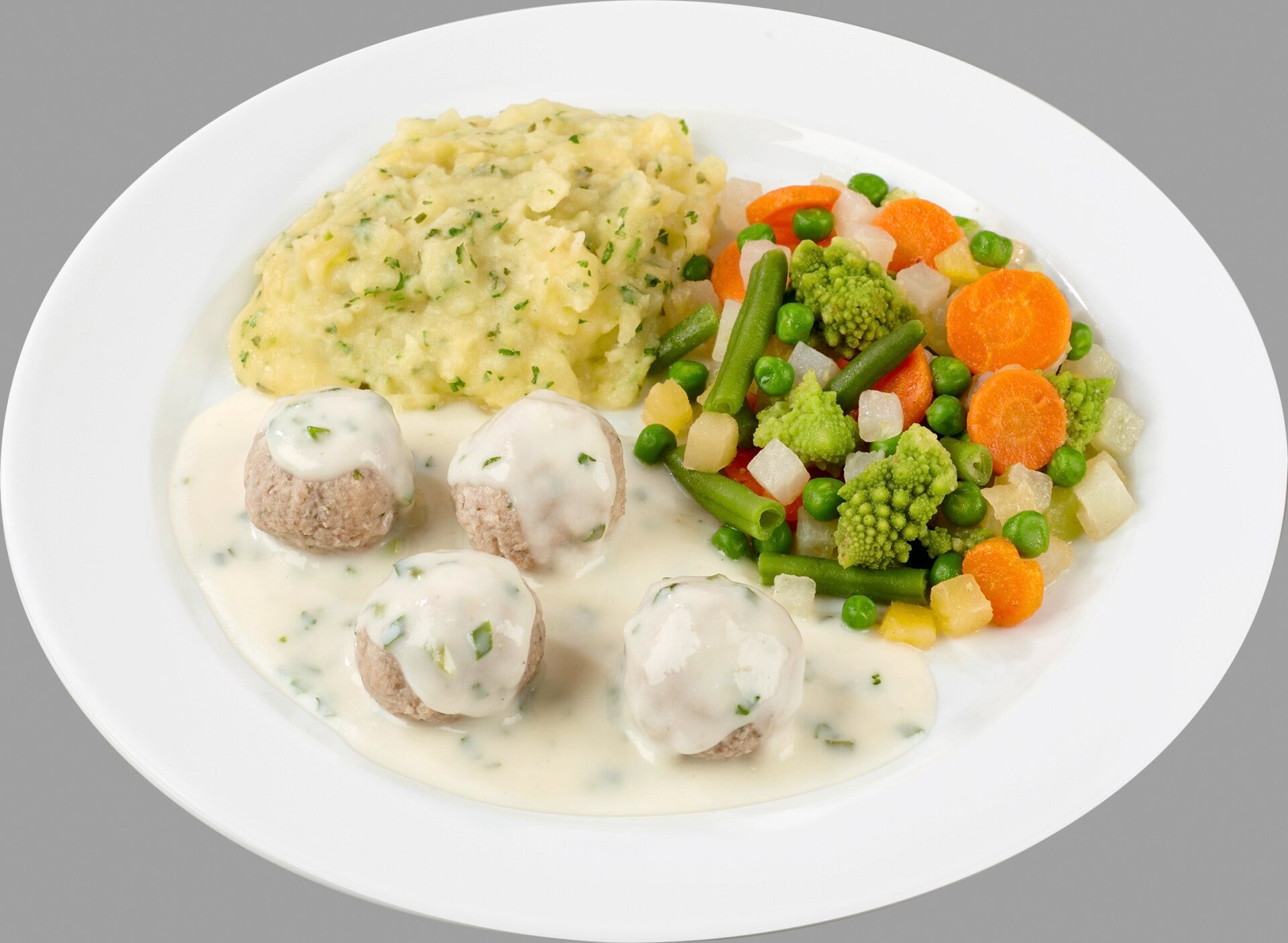 23095 Hackbällchen vom Schwein und Rind in Meerrettichsoße, dazu buntes Gemüse und Stampfkartoffeln
