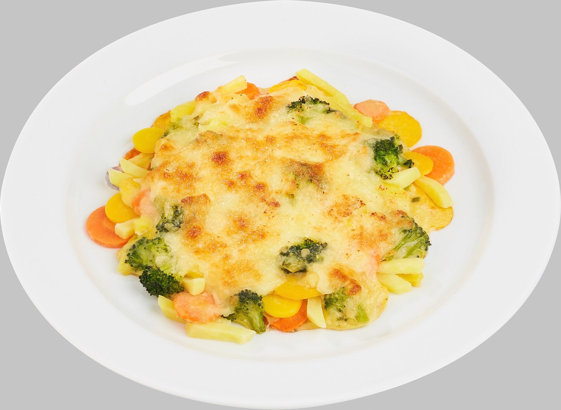 63585 Kartoffel-Gemüse-Auflauf mit Brokkoli, Möhren und Zwiebeln in heller Soße, mit Käse überbacken