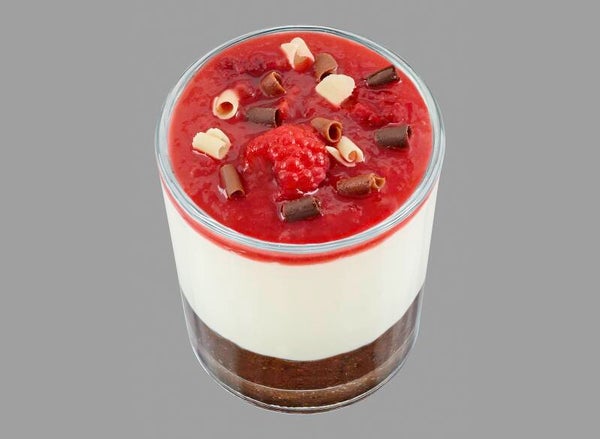 Allergenhinweise: G, G1, G3, M, Me, La GE 100g - Panna cotta mit Himbeersoße auf Keksboden