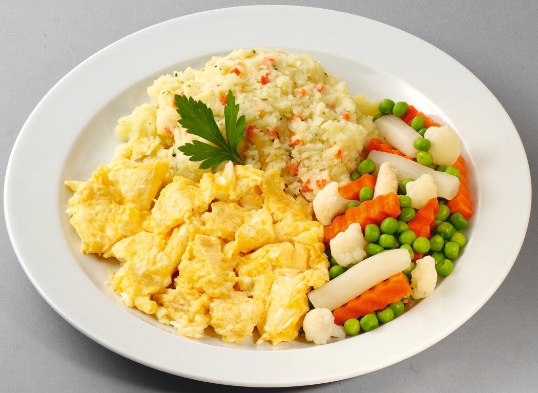 66581 Goldgelbes Rührei mit Gemüse „Leipziger Allerlei“, dazu Frühlingspüree